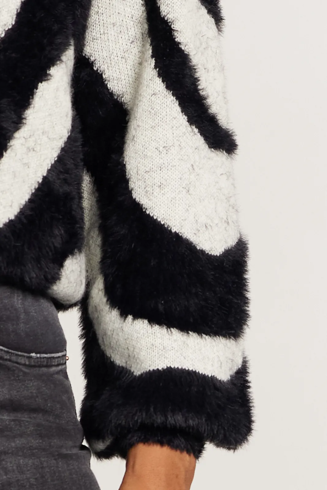 We love how the knit combines a relaxed fit and slight balloon sleeves with a contemporary marble pattern; delicate melange speckles are featured in the off-white, whilst the black in a raised faux fluffy texture – adding touch of uniqueness to your outfit and ensuring you stay warm and comfortable. Whether paired with jeans or trousers, over layered over a dress this pullover is a go-to choice for creating a chic and comfy ensemble.