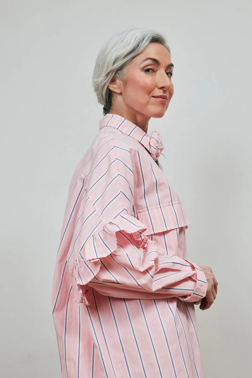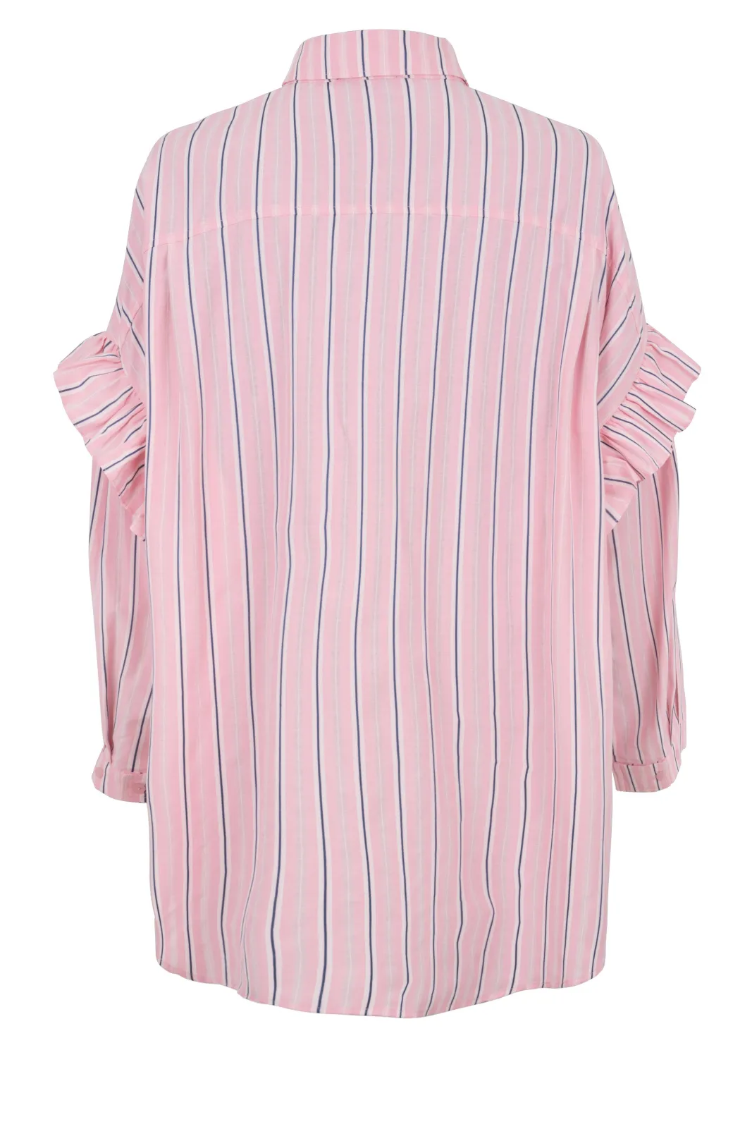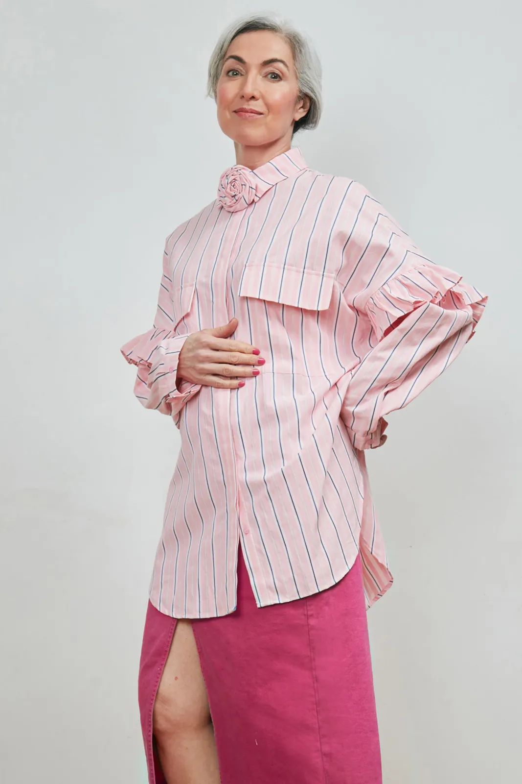 The Flowercras pink striped shirt is meticulously crafted to provide a flattering fit, ensuring comfort and a relaxed silhouette that effortlessly transitions between everyday wear and more formal occasions. Crafted from organic cotton, the material provides a soft and comfortable feeling against the skin, making it a favourite in your wardrobe. It comes in a boxy fit, featuring two maxi chest pockets, long sleeves and hidden button placket. The frill sleeve detail, and detachable rose at the collar add intricate and feminine touches.