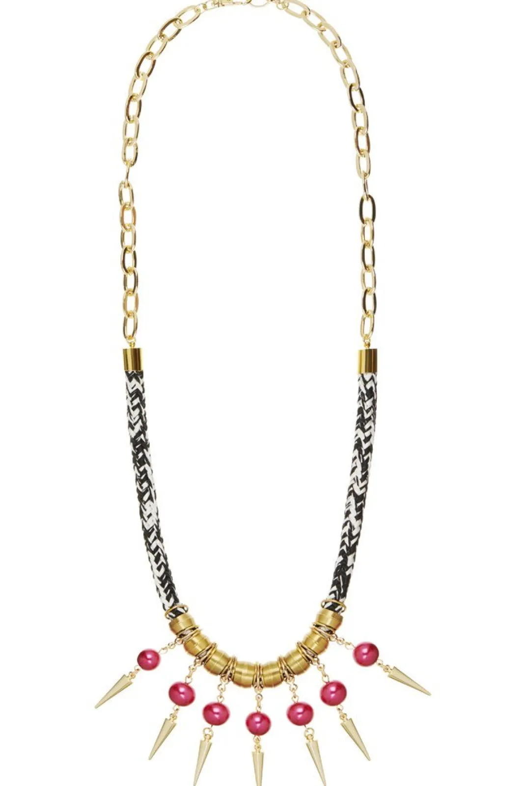 Add edge and attitude to any outfit with our Crystal Pink Pearl & Gold Plated Spikes Statement Necklace, exclusively designed and hand crafted by Dark Horse Ornament for our Strike Out Ageism campaign with charity Wellbeing of Women. Featuring hot pink pearls and gold plated spikes, it’s finished with a gold plated chain and a black and white cord featuring a light-reflective woven trim that goes from invisible to visible as you move.