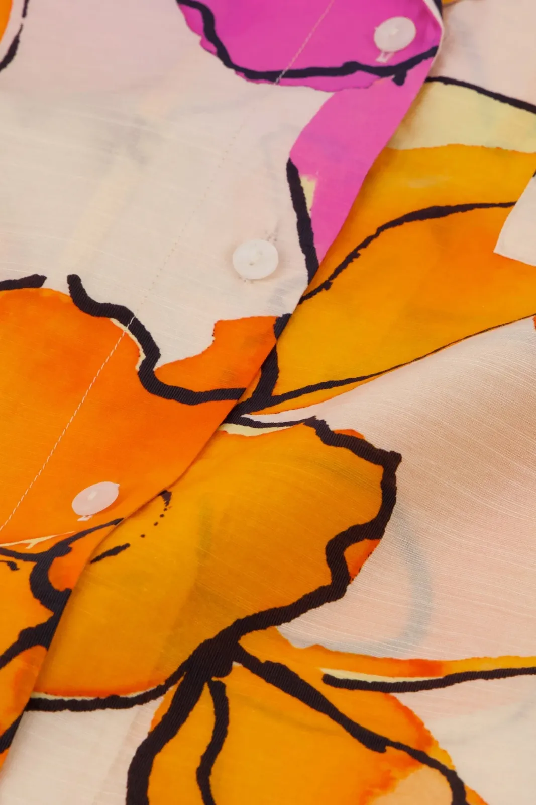 The loose short sleeves offer a breezy and comfortable fit, while the classic collar and button detailing add a touch of sophistication. Crafted on an off-white base, the freestyle floral print in orange and pink hues adds a playful and vibrant charm. The cool square cut oversized shirt silhouette ensures a versatile fit that complements various body shapes, creating an easy-to-style piece for any occasion that is highly modern and fresh.