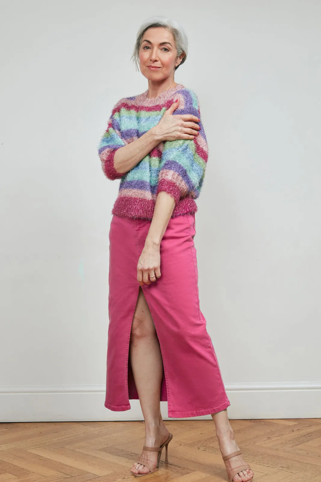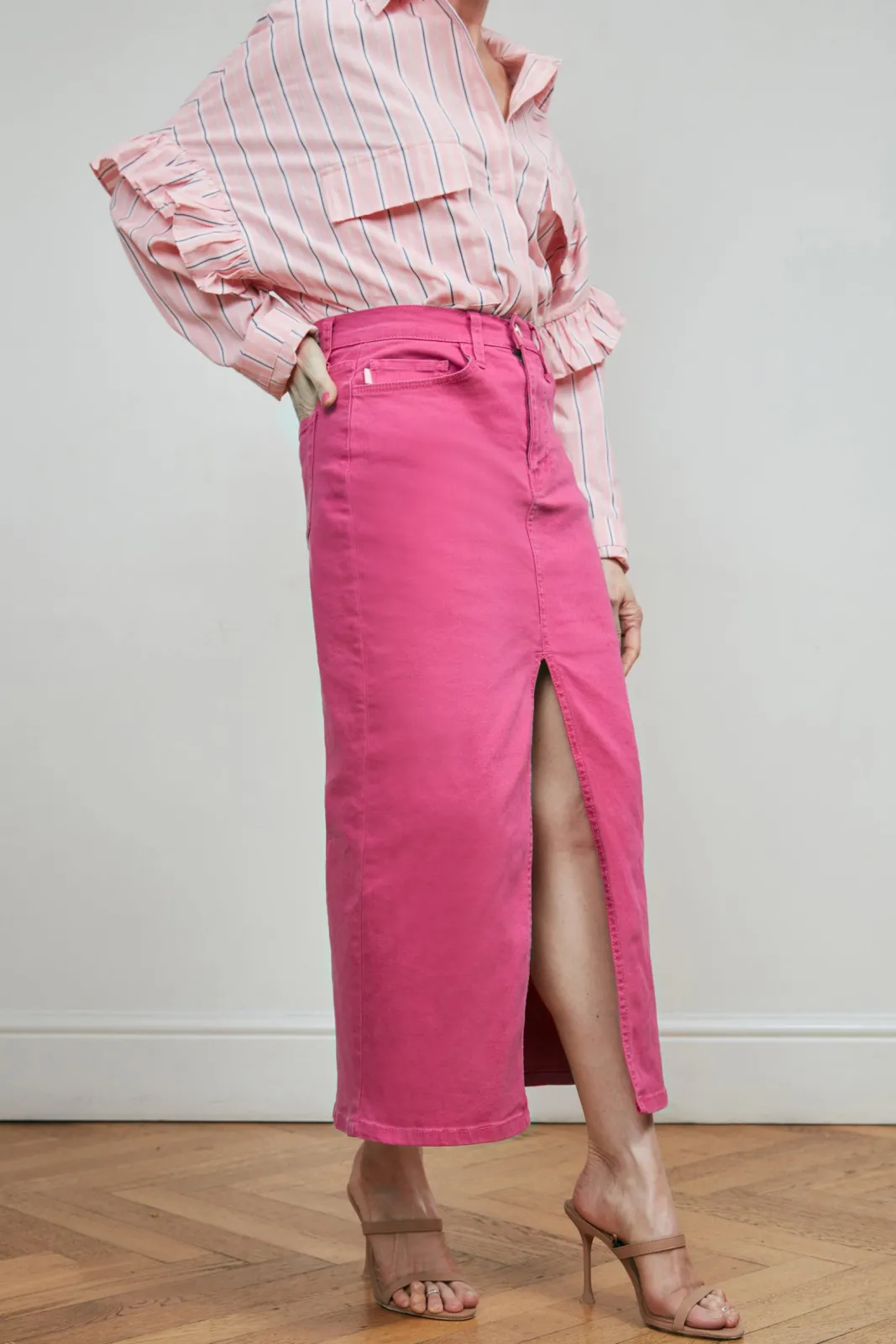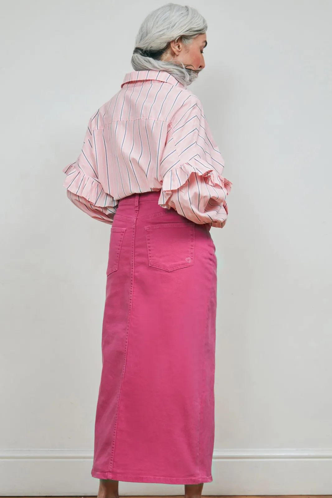 A vibrant update on the classic denim midi skirt, the Carlyne Hot Pink Midi Skirt is the perfect addition to your year-round wardrobe.The adaptability of this skirt allows you to express your style and mood, whether heading out for a lunch date, or to a party in the evening.