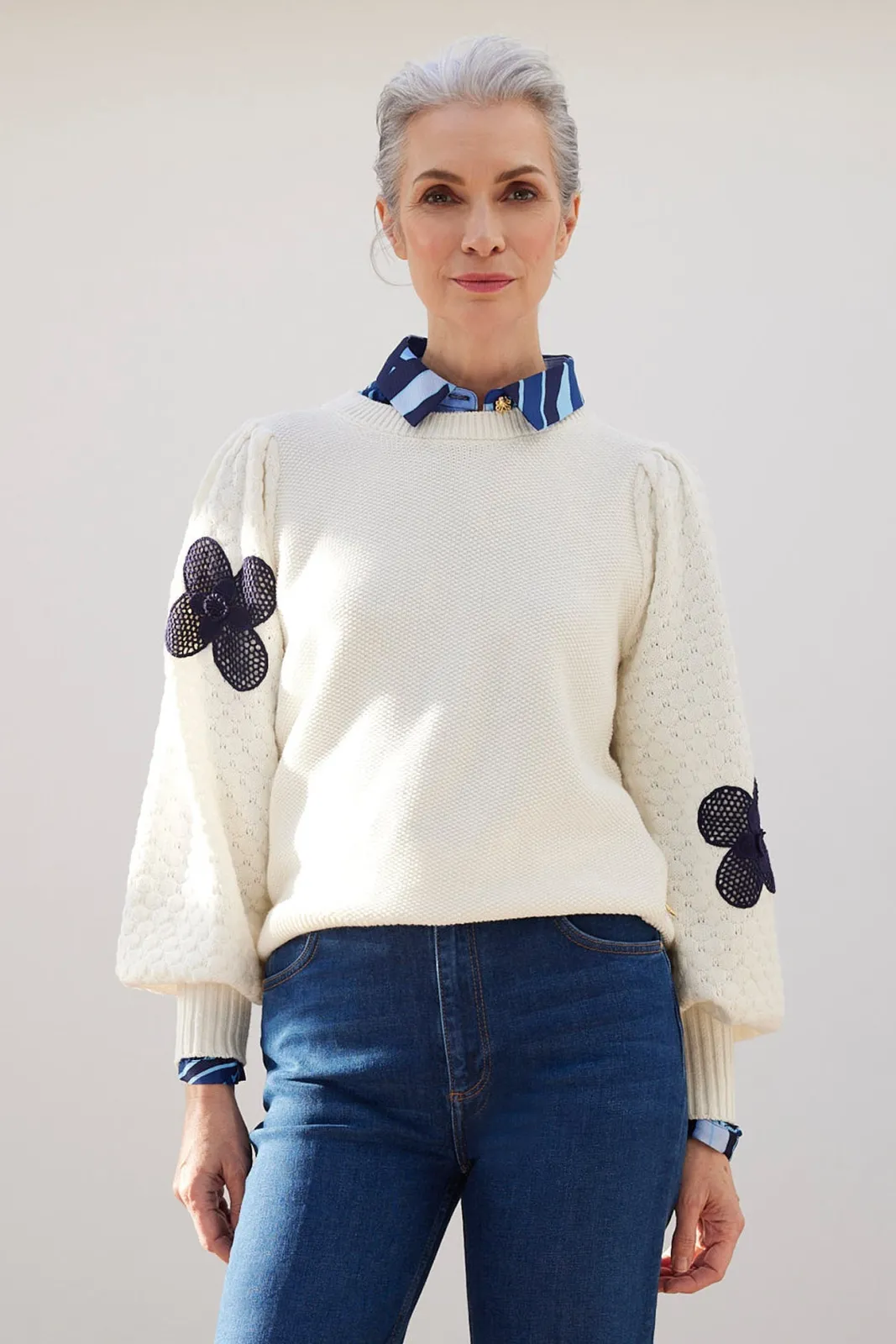 The perfect pick me up knit that goes with everything, the Treboli Pullover by Fabienne Chapot is a great staple piece. Featuring a ribbed hem and cuff in a classic round neck shape,the balloon style sleeves are made in a diamond knit and are finished with 3-d navy flower embroidery detail, bringing a touch of fun. A golden banana button featured on the hem is the perfect opulent, playful detail.