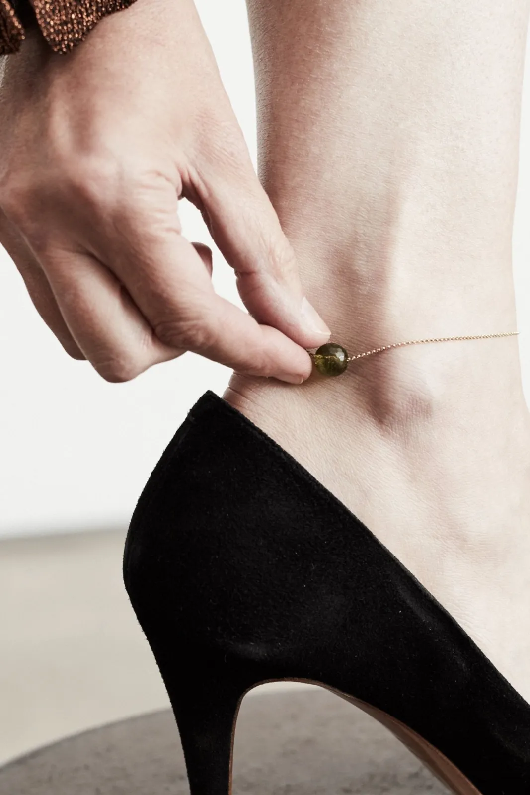 This unique delicate 9kt solid gold necklace features a sliding faceted peridot. Fastened with a handmade minimalist clasp design, it can be attached to Gem & Tonic’s Gembud necklace and bracelet to make a longer necklace.