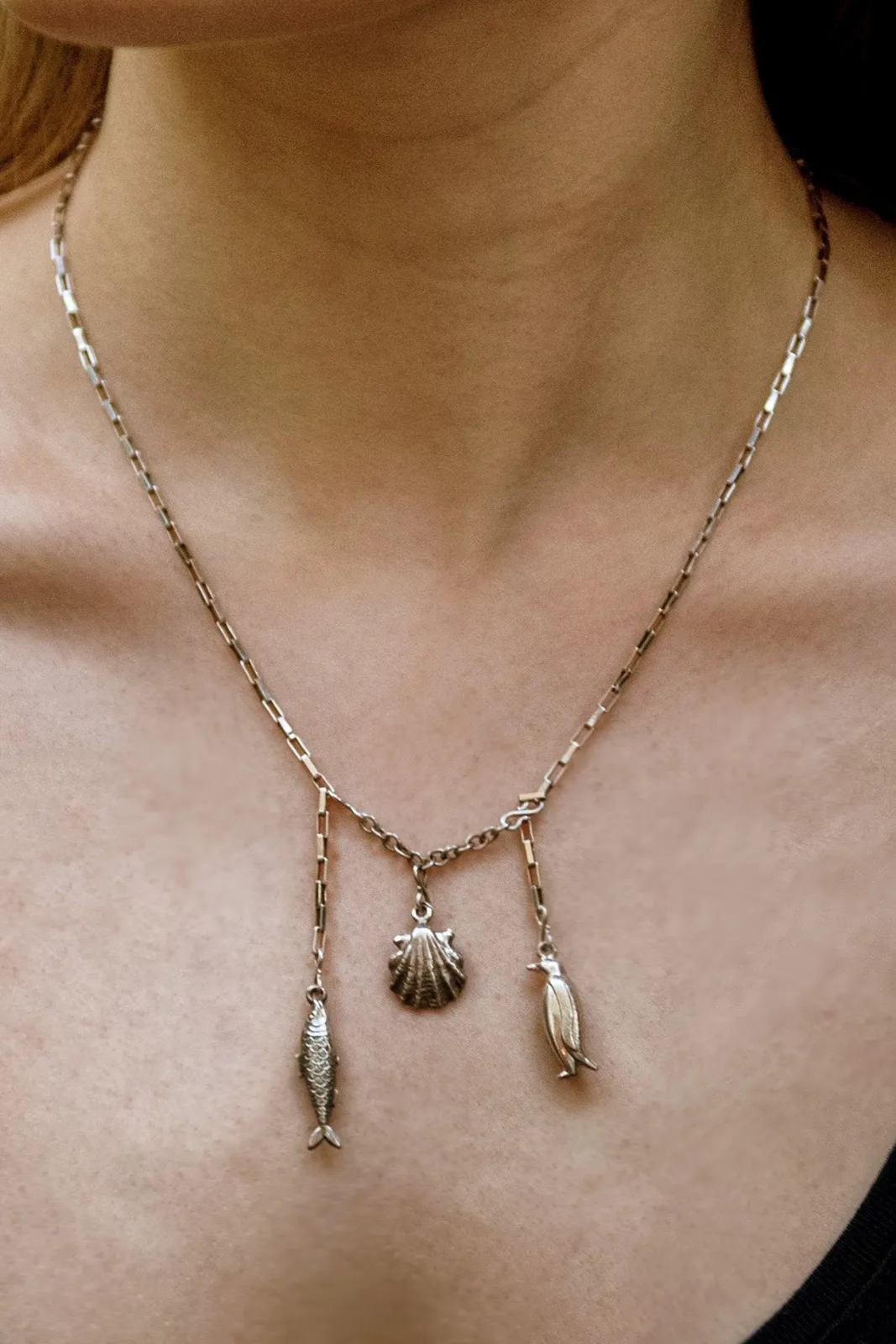 This is the short length sterling silver necklace. The combination of the sterling silver vintage charms compromises of a fish, a clam shell and a sweet dolphin – making a ‘charming’ combination for any marine lover.