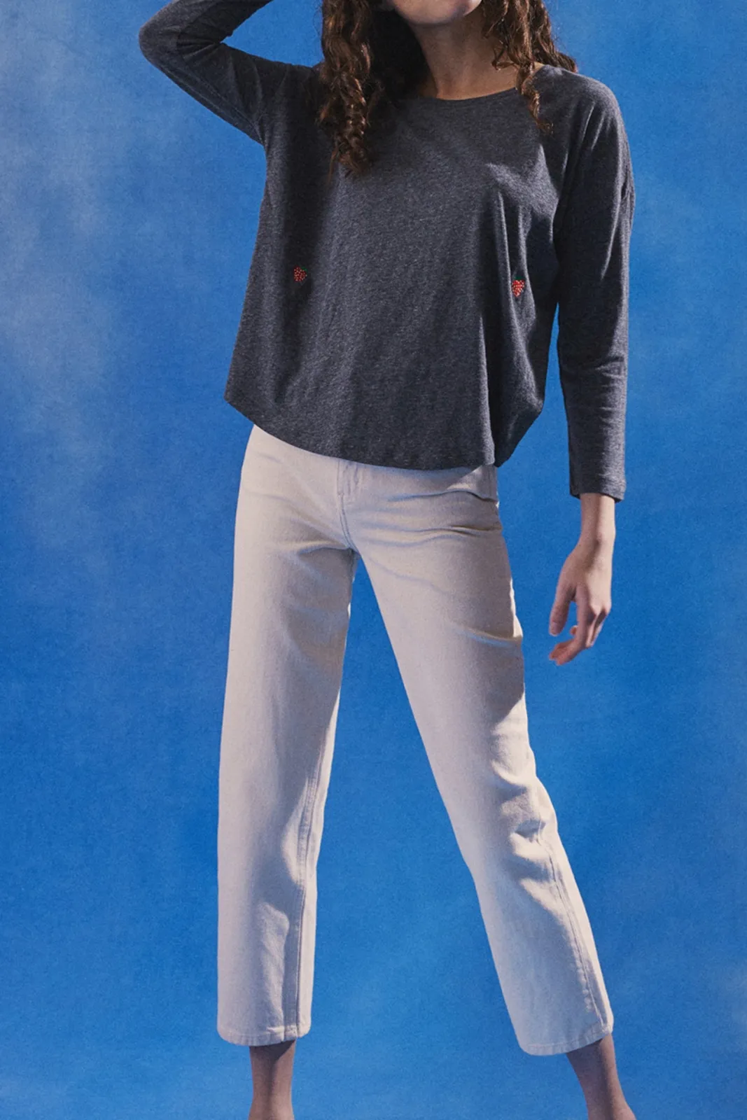 The perfect everyday basic, with a quirky springtime twist, this supersoft t shirt is sure to refresh all of your wardrobe favourites. The wonderfully soft cotton offers exceptional breathability alongside a cool and relaxed fit, whilst the round need and 3/4 sleeves keep the look sleek and preppy, making it perfect for layering or wearing alone in the warmer weather. Not to mention the dainty embroidered strawberries to add the perfect amount of seasonal detail.