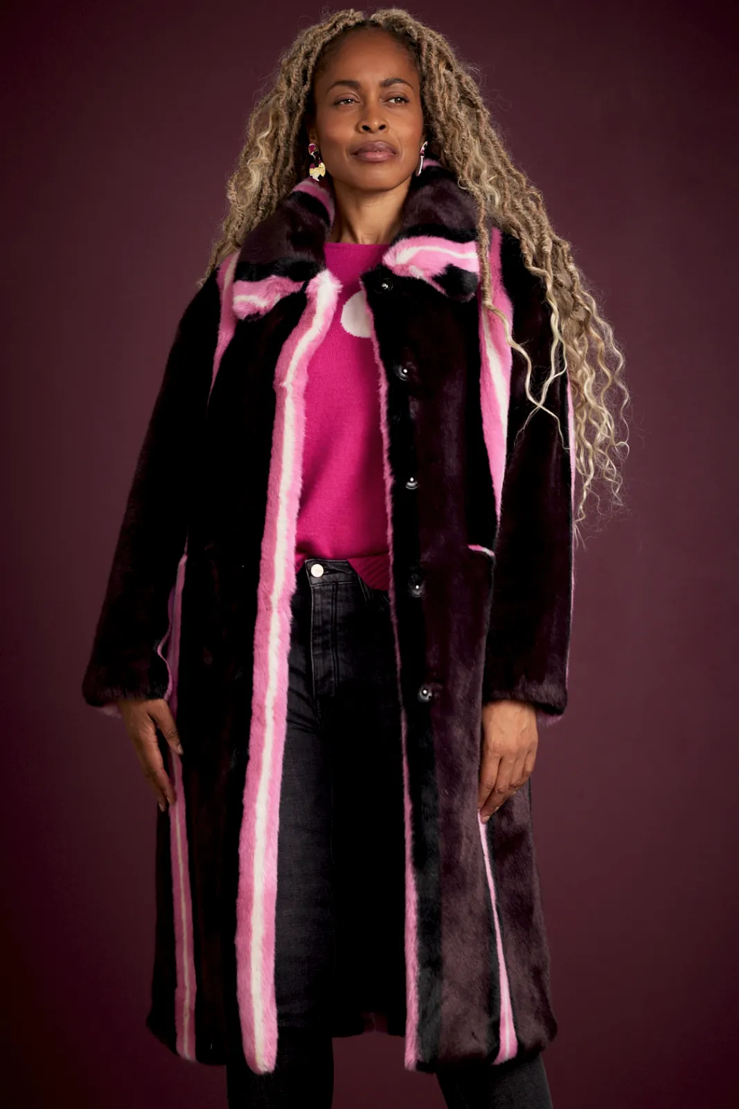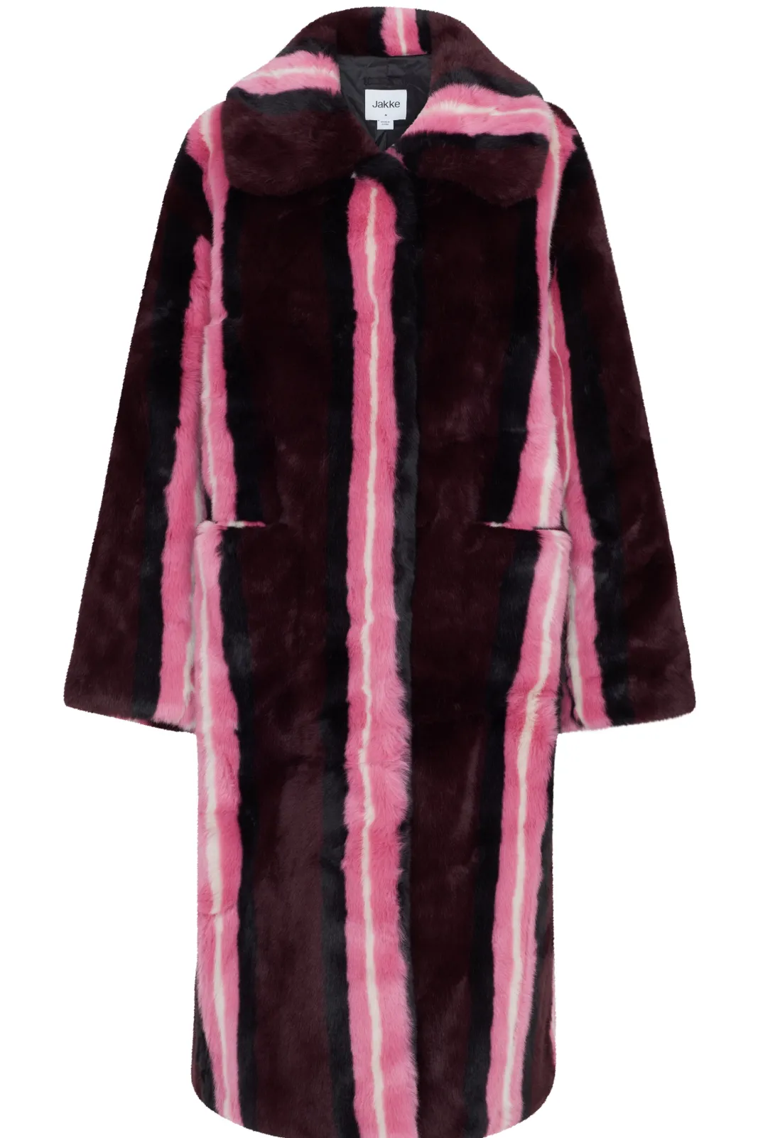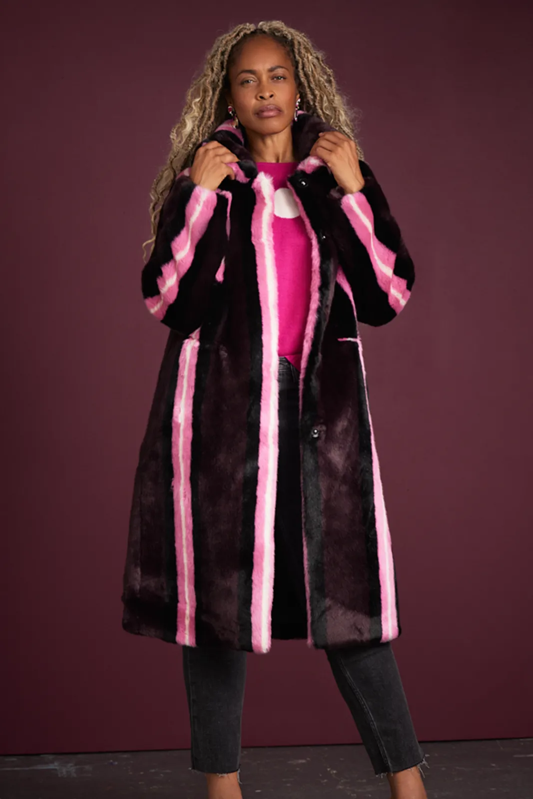 Make a statement in the faux fur Kelly Coat by Jakke. This coat is the perfect blend of comfort and vibrancy, making it a must-have addition to your wardrobe. The striking and vibrant colours take centre stage in this responsibly sourced style, with bold pink, black, chocolate and white stripes running vertically throughout.