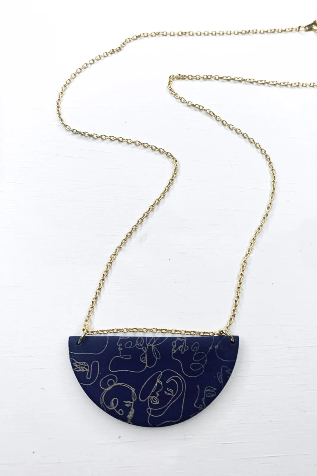 The beautiful faces print from No Shrinking Violet feels like a wonderful piece of artwork to accessorise your outfit with. Elevated wonderfully with the luxe gold colouring of the line drawing scrawled across the deep navy semi circle background. Made from a lightweight polymer clay attached to a 22ct gold-plated brass chain for a gorgeous finish.