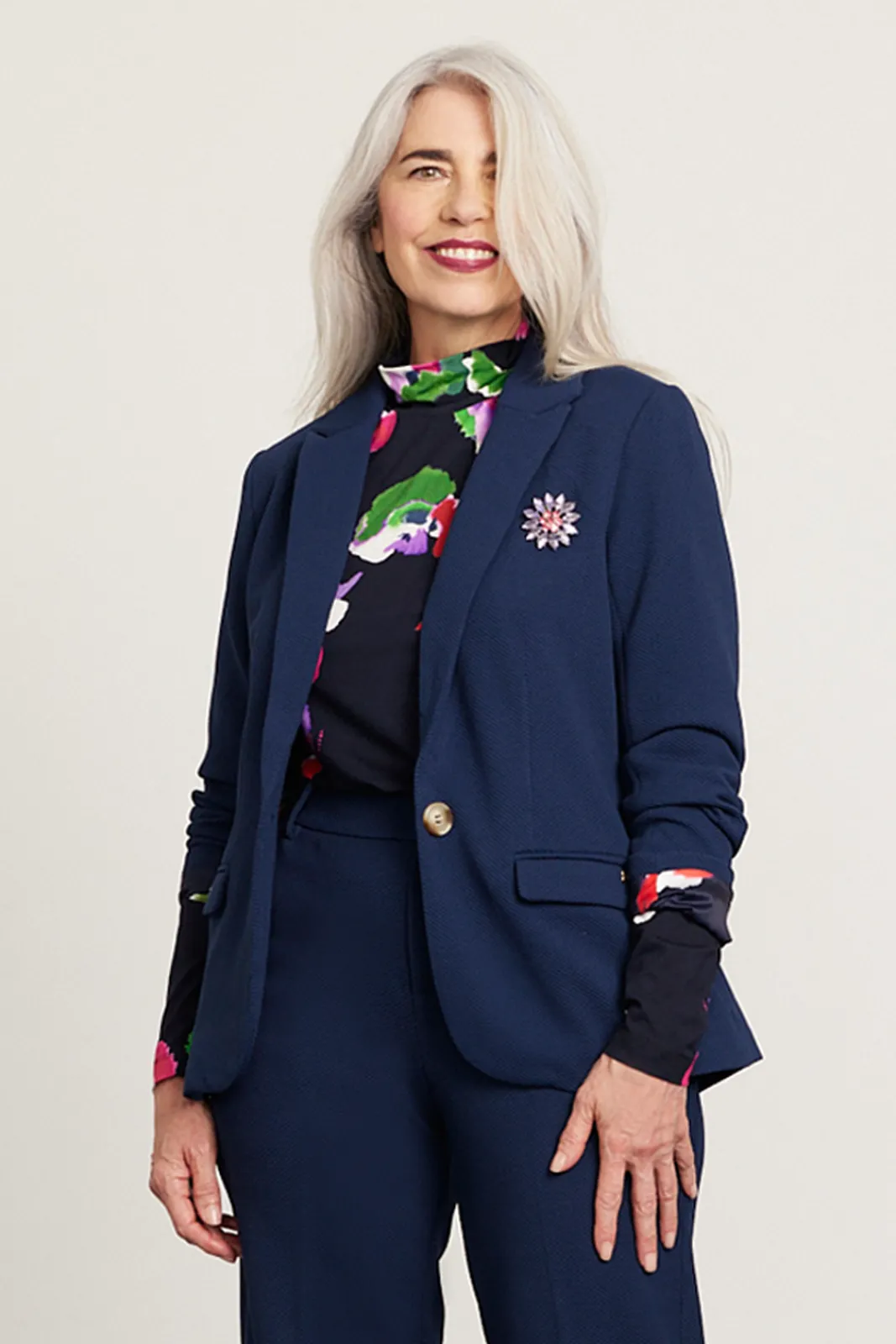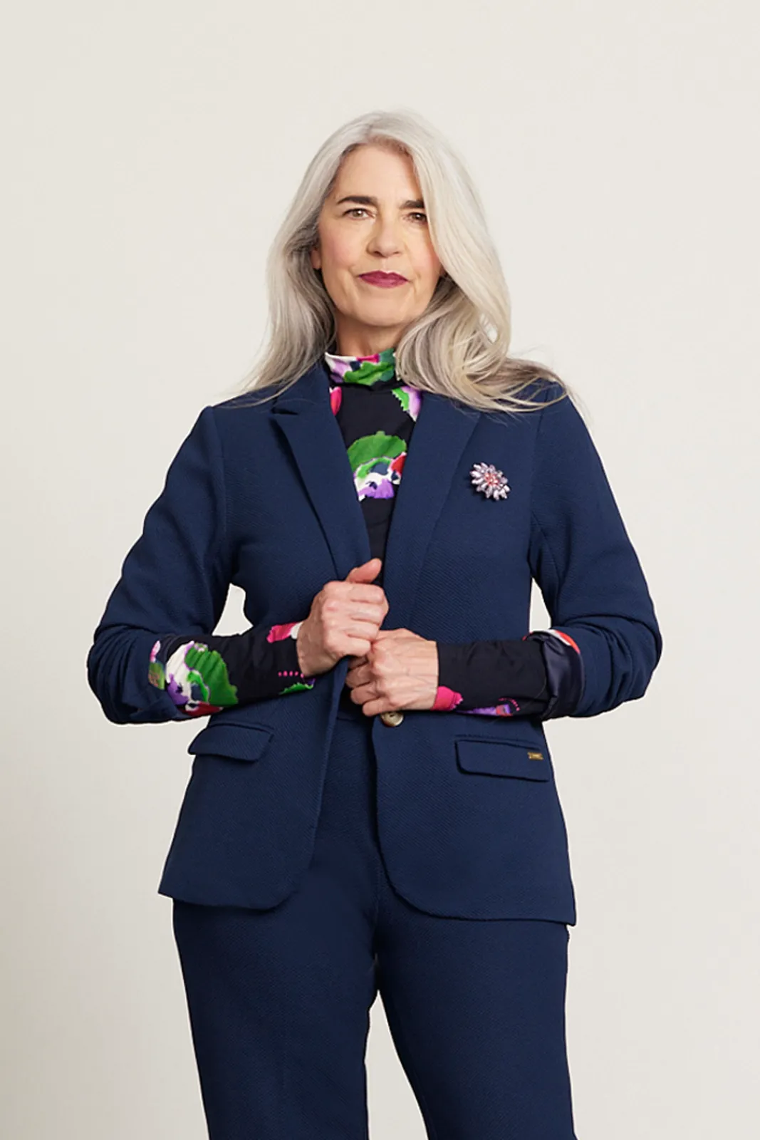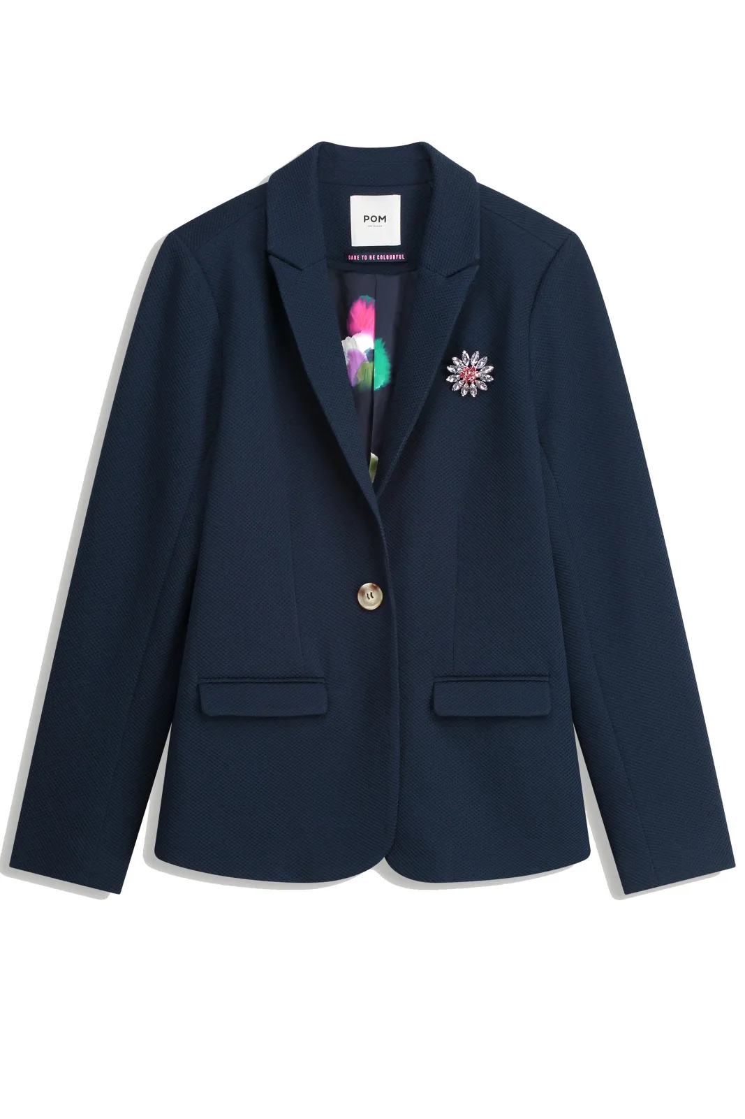 Featuring a stunning detachable brooch adorning the breast of the jacket, the blazer is crafted from a soft, subtle waffle texture and is lined with a beautiful hand-painted violets floral print (roll up the cuffs to show it off!)items. This timeless blazer is finished with flap pockets, a button fastening and a collar.