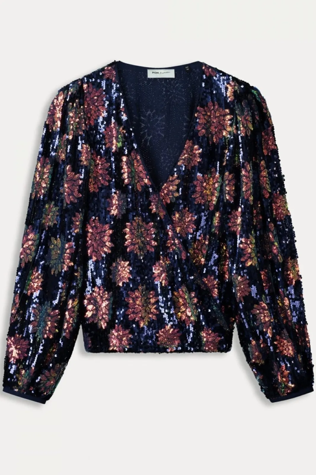 This captivating top is bedecked with a vibrant array of sequins in shades of purple, pink, and green that glisten and change in the light. Boasting a chic V-neckline, and elegantly wide-fitting sleeves that culminate in a delicate narrow elastic border, this top is designed to flatter with its wrap style.