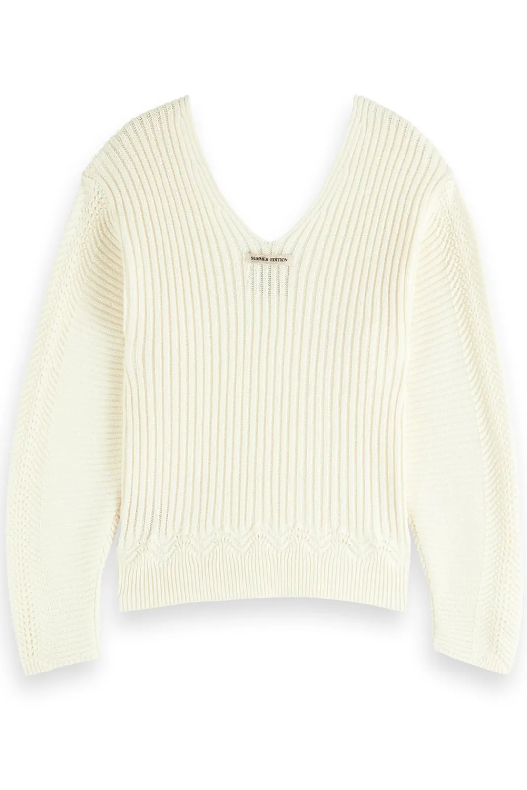 The unique feel of this jumper from Scotch & Soda turns this from a classic wardrobe staple, to a true head turner that you can’t imagine your wardrobe without. The stunning slightly cropped fit hugs the body, whilst the flattering open v neck and ribbed effect add some traditional elements to elevate the look. The long sleeves have a subtle voluminous fit and mixed stitch to add some gorgeous detail and drama to your silhouette. Finished to perfection with the slight dropped shoulder that allows the jumper to be worn as a sexy off shoulder jumper or with covered shoulders in the chillier weather.