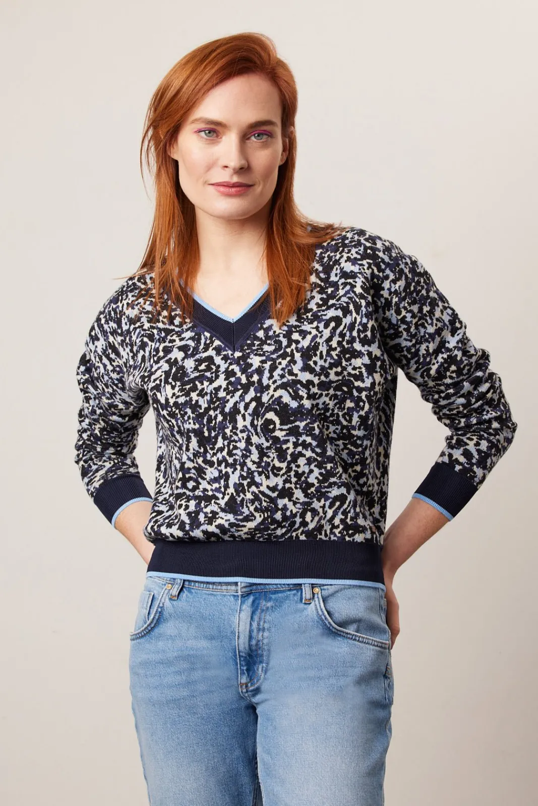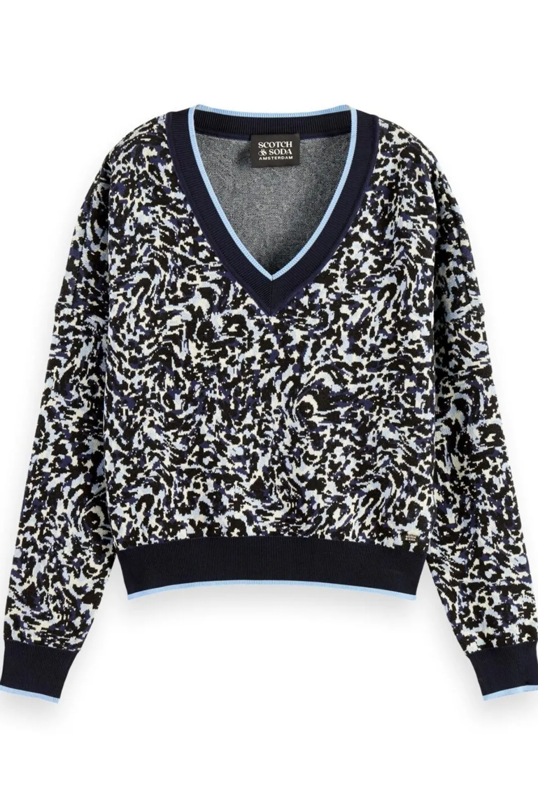 The Loose Fit Jacquard Knit from Scotch & Soda is the perfect piece for the transitional weather. A cosy yet light layer to pair with all of your wardrobe staples, made from a beautiful navy and black fabric complimented wonderfully by the deep navy cuffs and thin baby blue finishing. Finished to perfection with a classic v neck and regular fit, keeping the look casual and stylish.