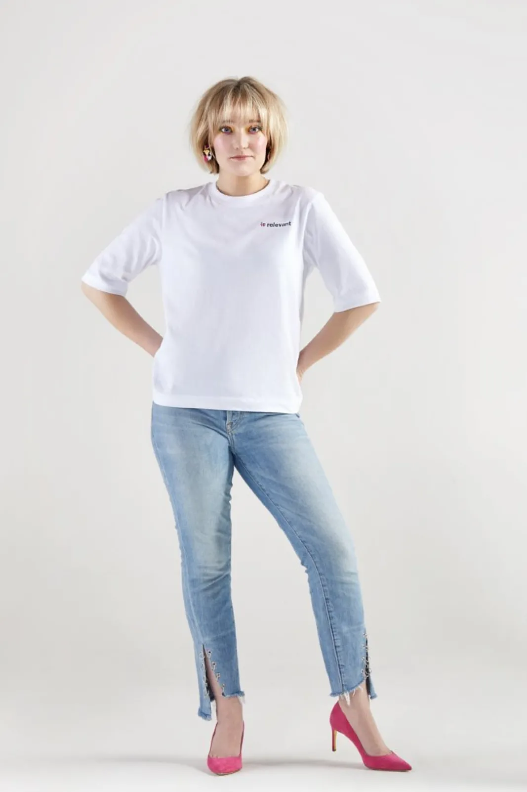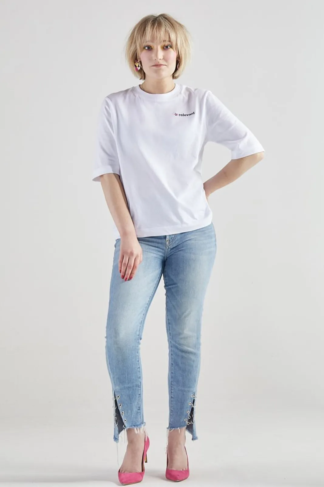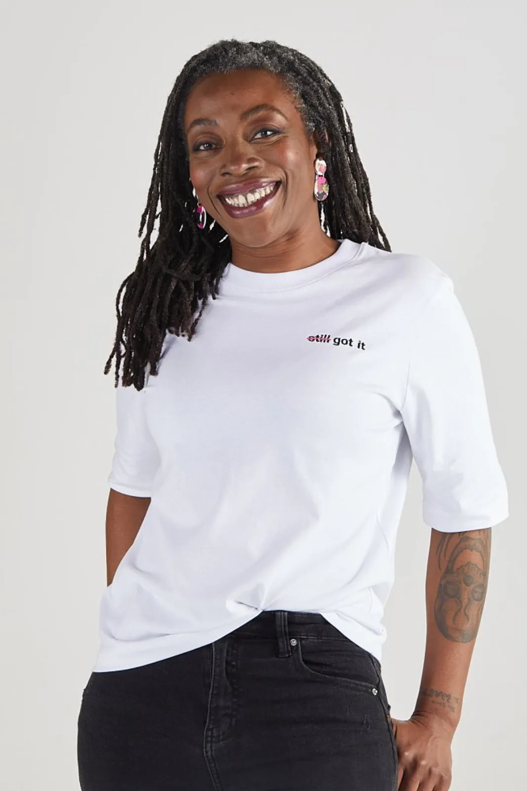 Make a statement against ageism – whilst looking seriously cool – in our boyfriend cut White T-Shirt, featuring a hand embroidered slogan that speaks most to you.