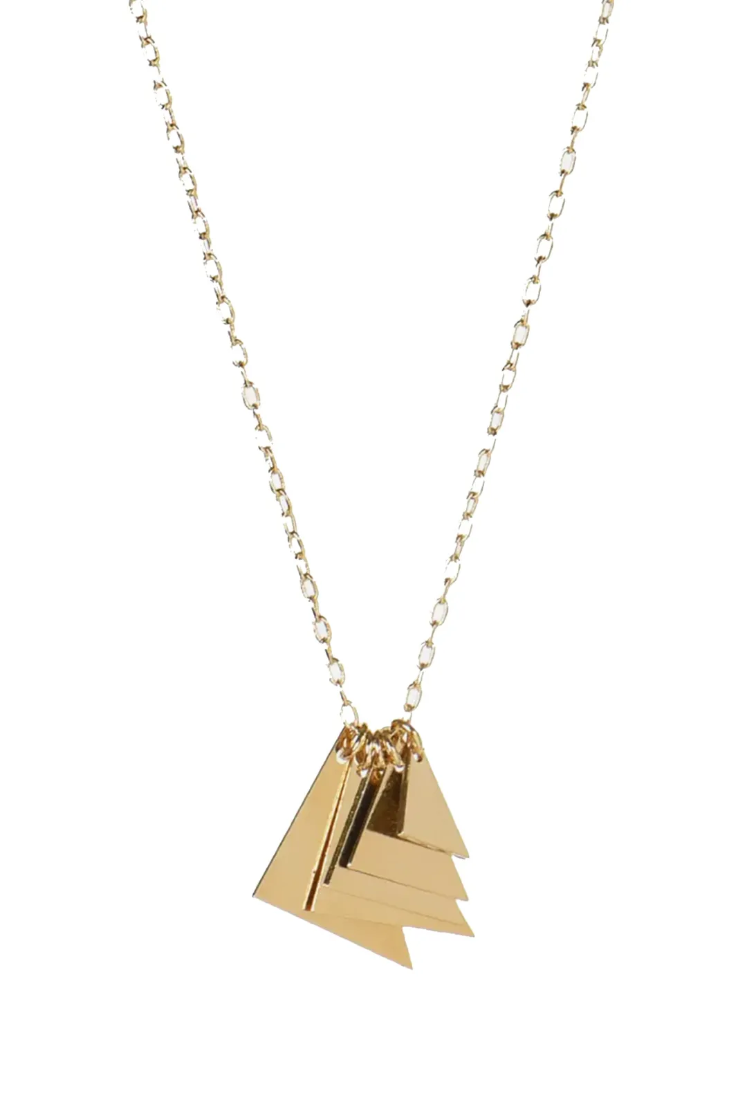 Geometry meets luxury with the Ludlow Gold Plated Triangles Necklace, featuring a gold chain and 5 pendants of various size triangles. It looks great layered with other necklaces such as our Gina Navy Crescent Moon Gold Plated Necklace or on its own for a simple, chic minimal look.