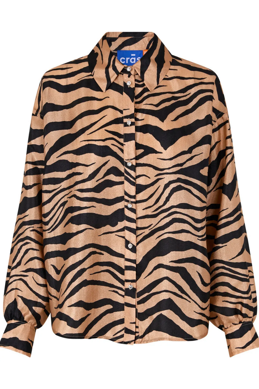The stylish piece features Cras’ signature diamanté decorative buttons down the front and on the cuffs, voluminous balloon sleeves, and is crafted from recycled polyester, making it a great conscious, sustainable choice. We particularly love how the animal two-tone pattern and the fabric’s subtle sheen adds a touch of elegance and timeless style to balance the shirt’s overall loose and effortless silhouette.