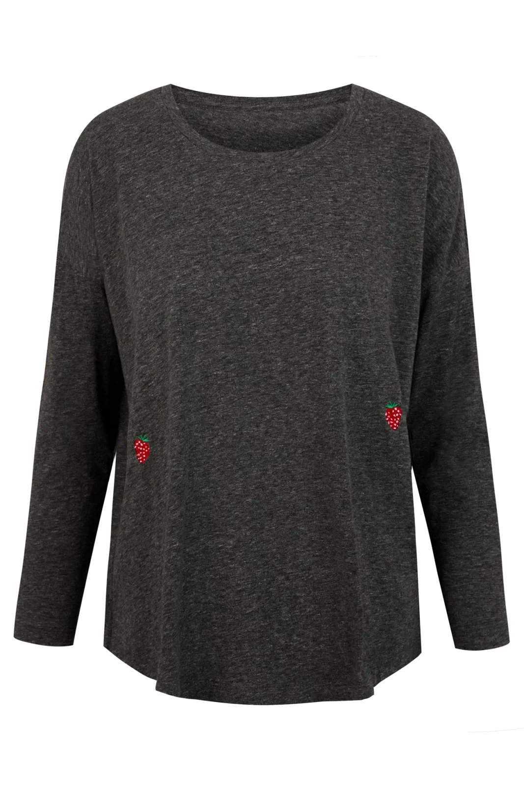 The perfect everyday basic, with a quirky springtime twist, this supersoft t shirt is sure to refresh all of your wardrobe favourites. The wonderfully soft cotton offers exceptional breathability alongside a cool and relaxed fit, whilst the round need and 3/4 sleeves keep the look sleek and preppy, making it perfect for layering or wearing alone in the warmer weather. Not to mention the dainty embroidered strawberries to add the perfect amount of seasonal detail.