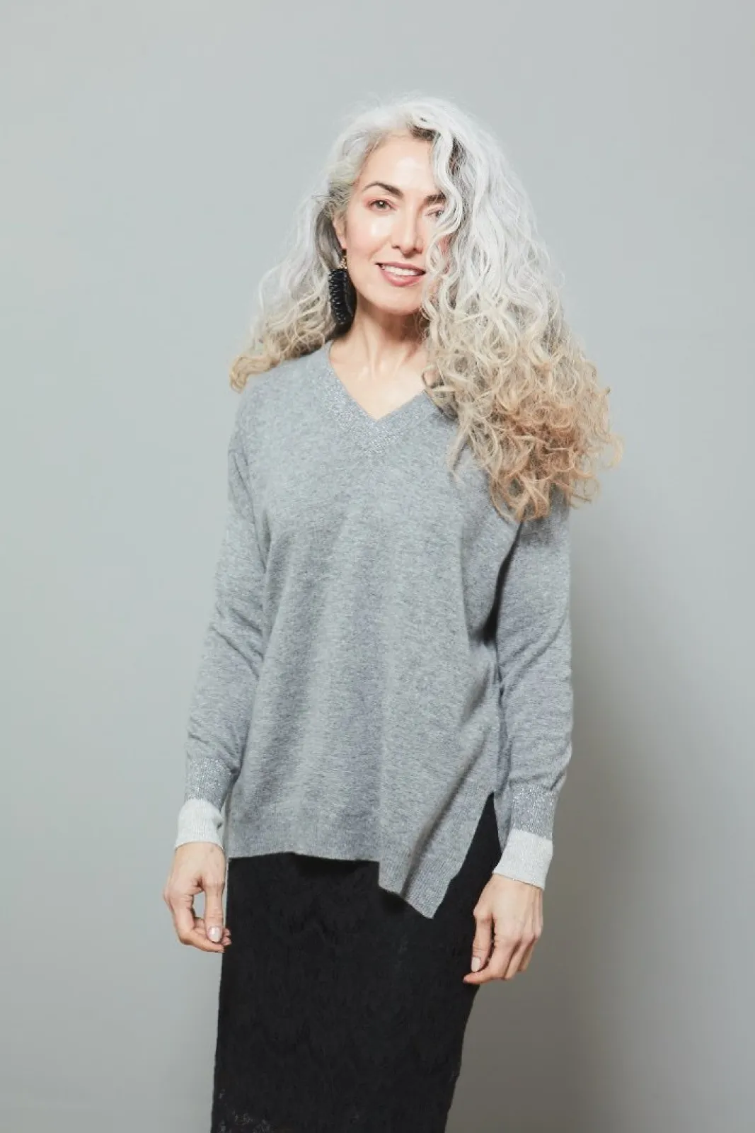 Reflecting the differing shades within one person, the Mercury cashmere jumper features different tones of grey that become more or less visible depending upon the light. Predominantly charcoal, a lighter shade is featured on the cuffs, whilst sparkly silver lurex threading is weaved throughout the neckline, cuffs and centre of the back.