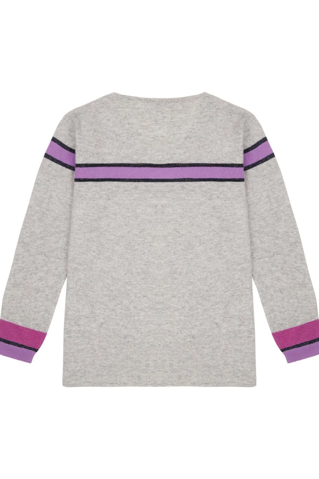 Universally flattering, the Theia contrasts soft grey with striking shades of purple and a dash of navy. A relaxed fitted shape with a scooped neckline, it is finished with beguiling navy lurex weaved throughout the navy to add a subtle touch of glamour making it perfect for both day and night. Made of 100% luxury cashmere, only the finest white and light grey fibres have been used, which has been ‘top’ dyed to give it a superior depth of shade and the best final touch.