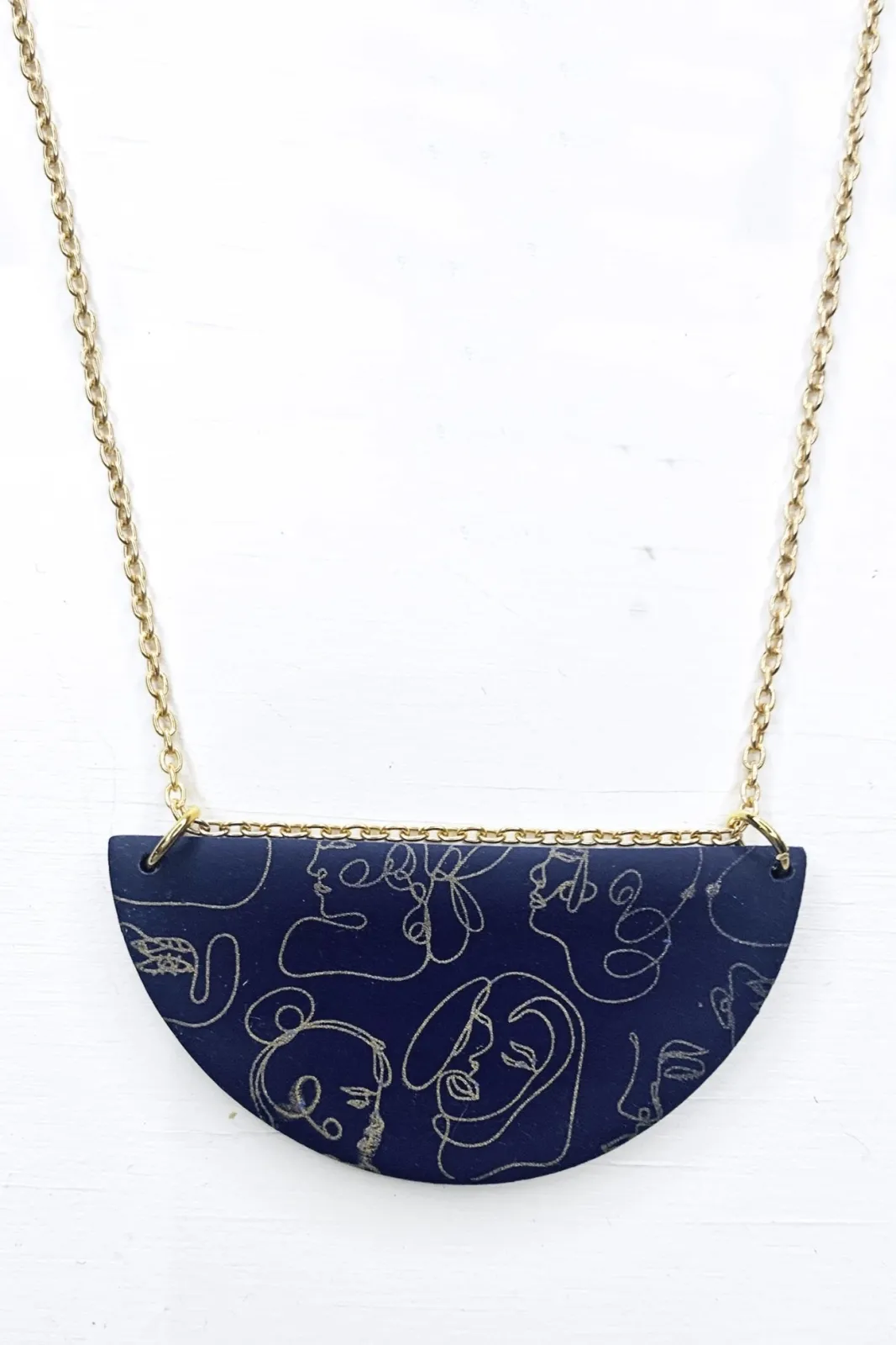 The beautiful faces print from No Shrinking Violet feels like a wonderful piece of artwork to accessorise your outfit with. Elevated wonderfully with the luxe gold colouring of the line drawing scrawled across the deep navy semi circle background. Made from a lightweight polymer clay attached to a 22ct gold-plated brass chain for a gorgeous finish.