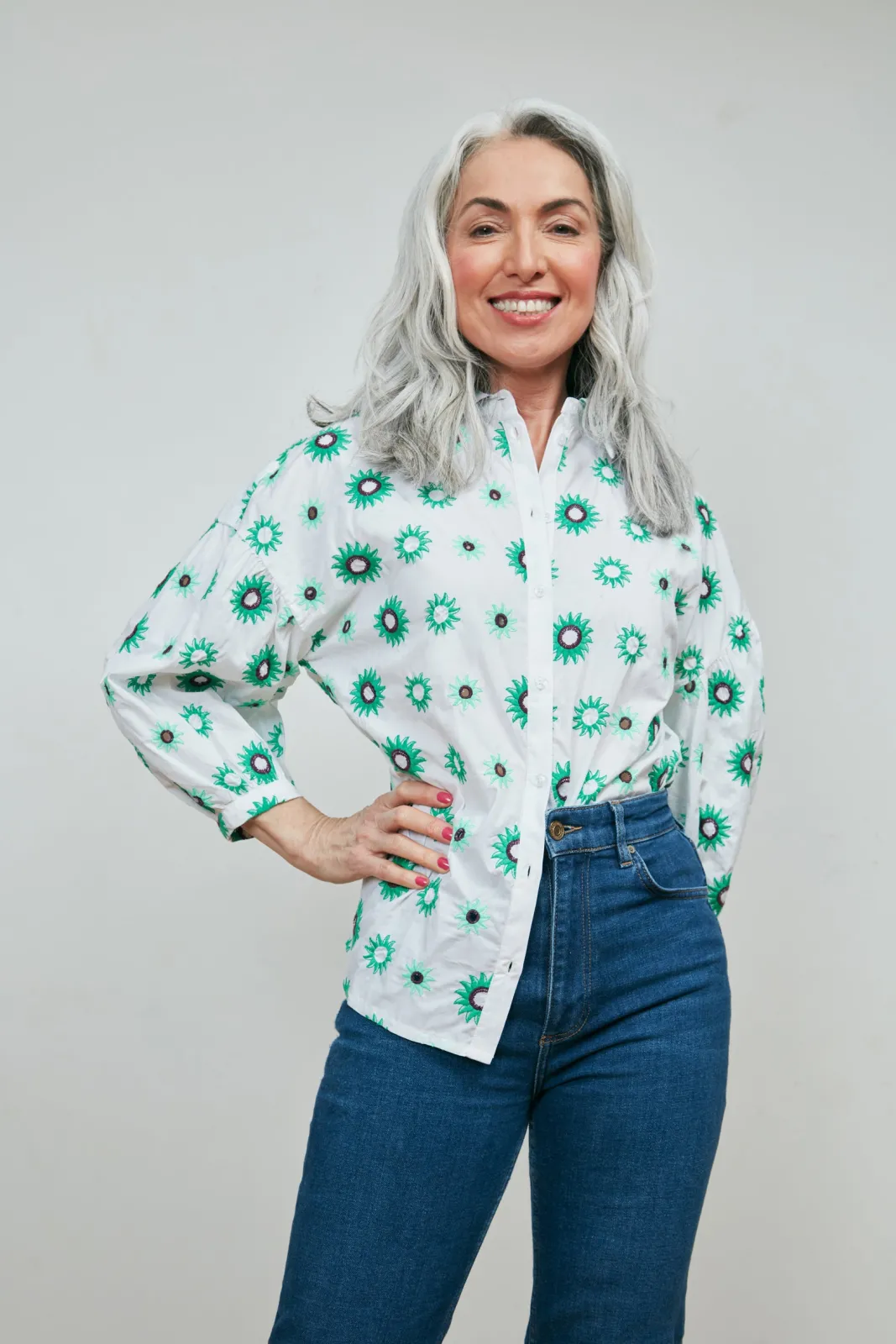 Our model, Shirley, is wearing the Sicilian Cotton Blouse with the .