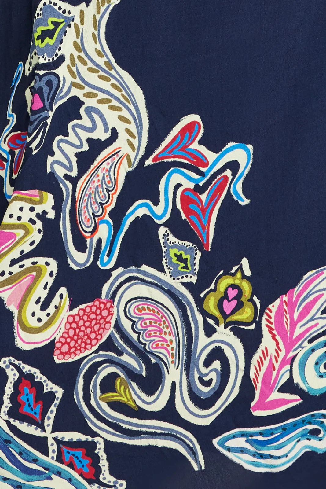 The blue midi dress, crafted from flowing crepe fabric, showcases a hand-painted printed design, incorporating shades of pink and green to embellish the sleeves, sides, and hem of the dress. A row of buttons are featured down the front and the wide sleeves are nicely finished with a cuff. Elevate your evening attire with heels, or go for a laid-back daytime vibe by choosing boots or the .