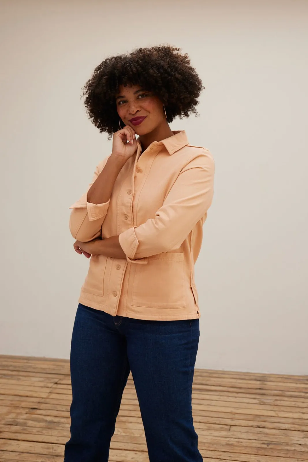The Fay Jacket from Reiko is a timeless casual jacket, made perfect for the gorgeous spring sunshine in the delicious peach parfait shade. The relaxed fit, long slit cuffs and front patch pockets create an ultra cool, utility look with a twist, whilst the slit sides add some movement. Finished to perfection with expertly camouflaged peach buttons, allowing the sugary sweet shade of the jacket take centre stage.