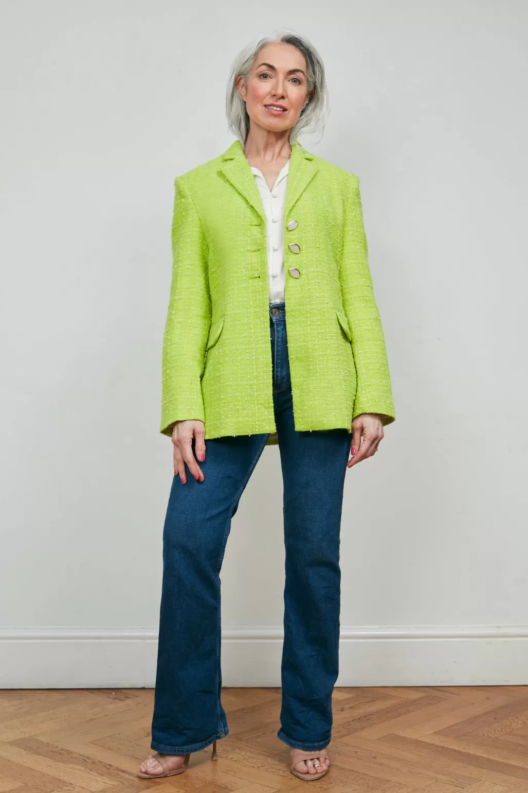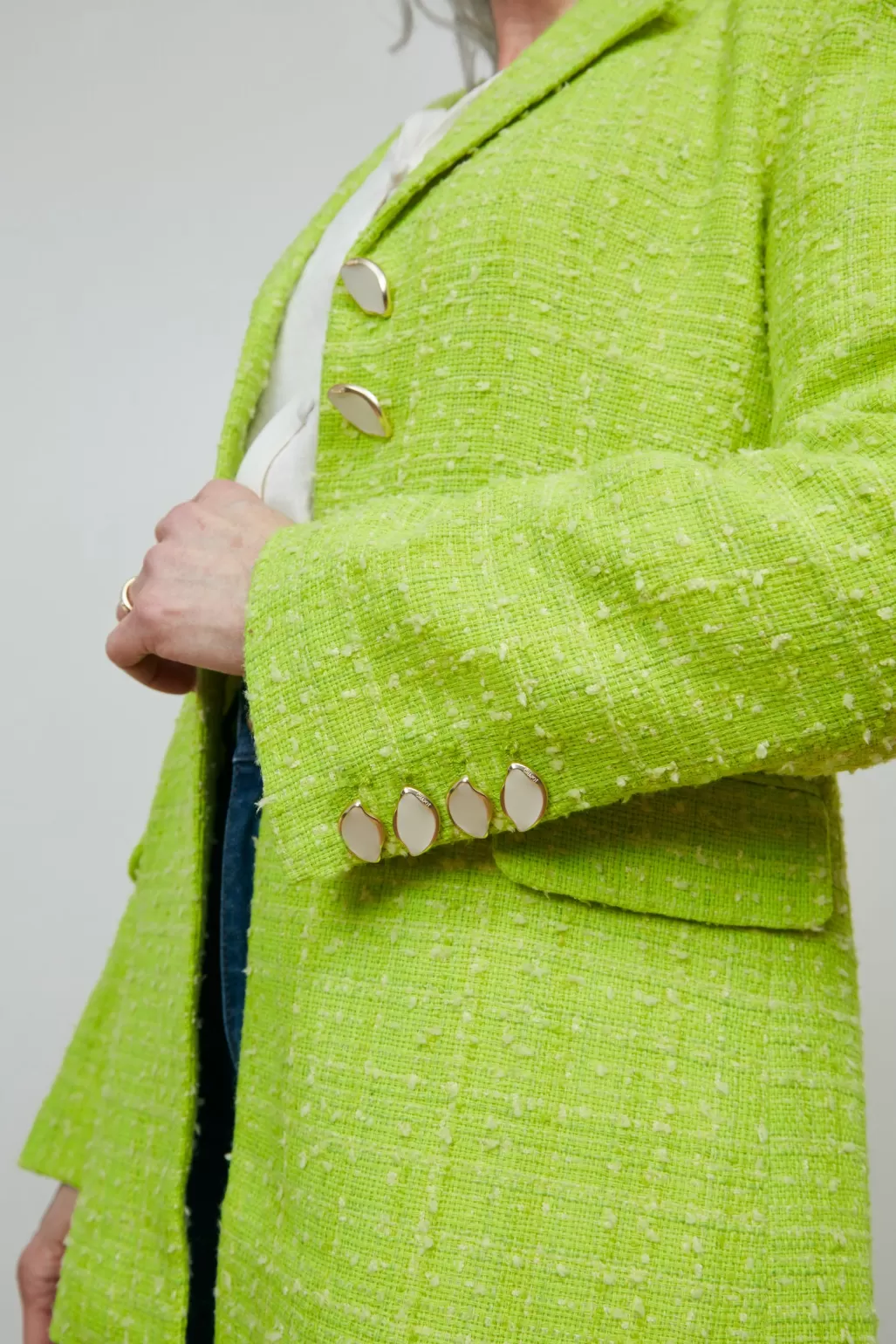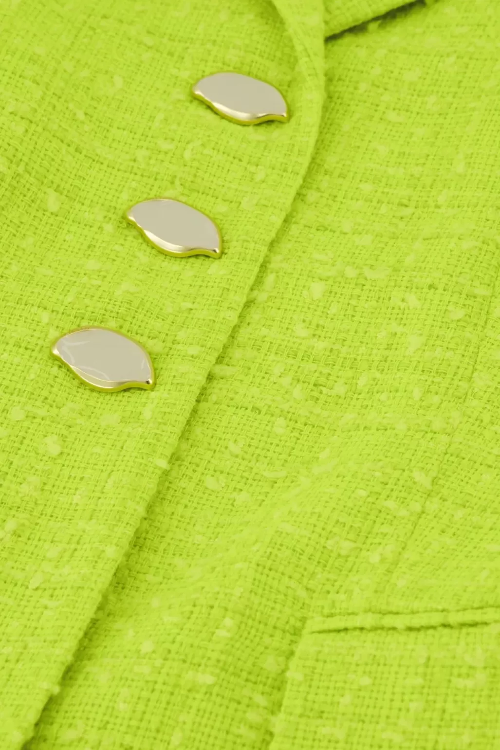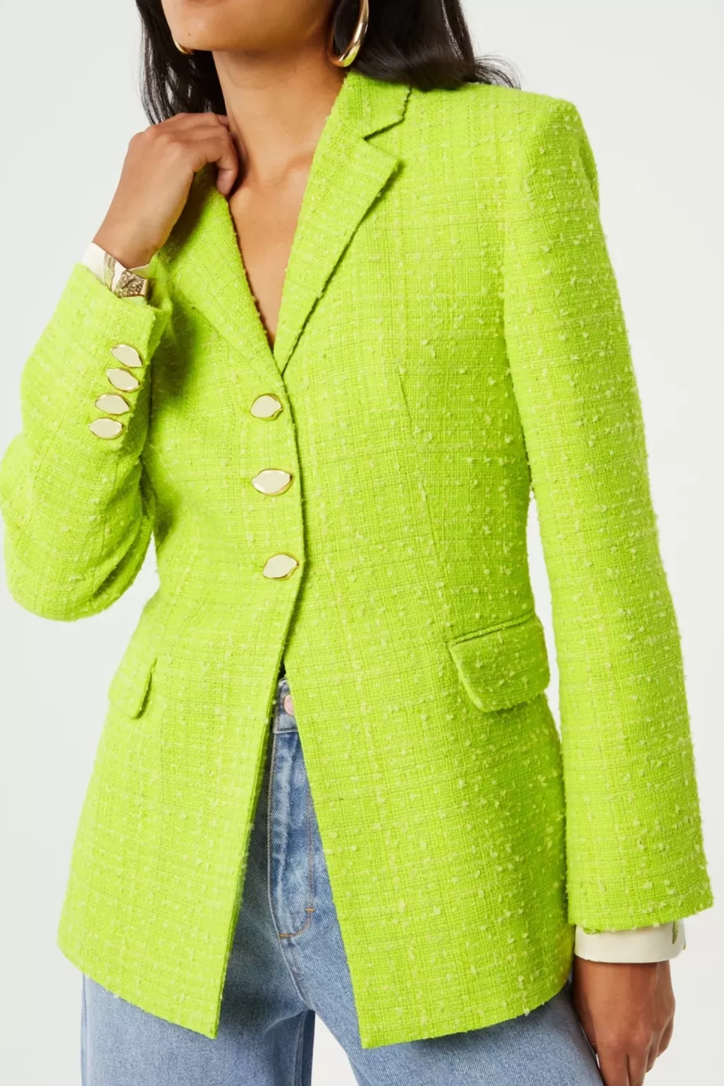 The fit of the Cher lime blazer is tailored for a flattering silhouette that exudes refined femininity. It features a single-breasted design with a classic collar, lapels, and a three-button closure. The unique white and gold buttons, three down the front and four on each sleeve, add distinctive details that elevate its overall elegance.