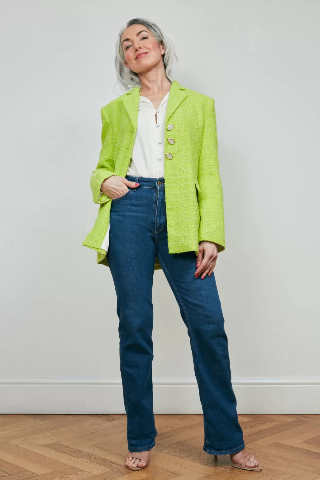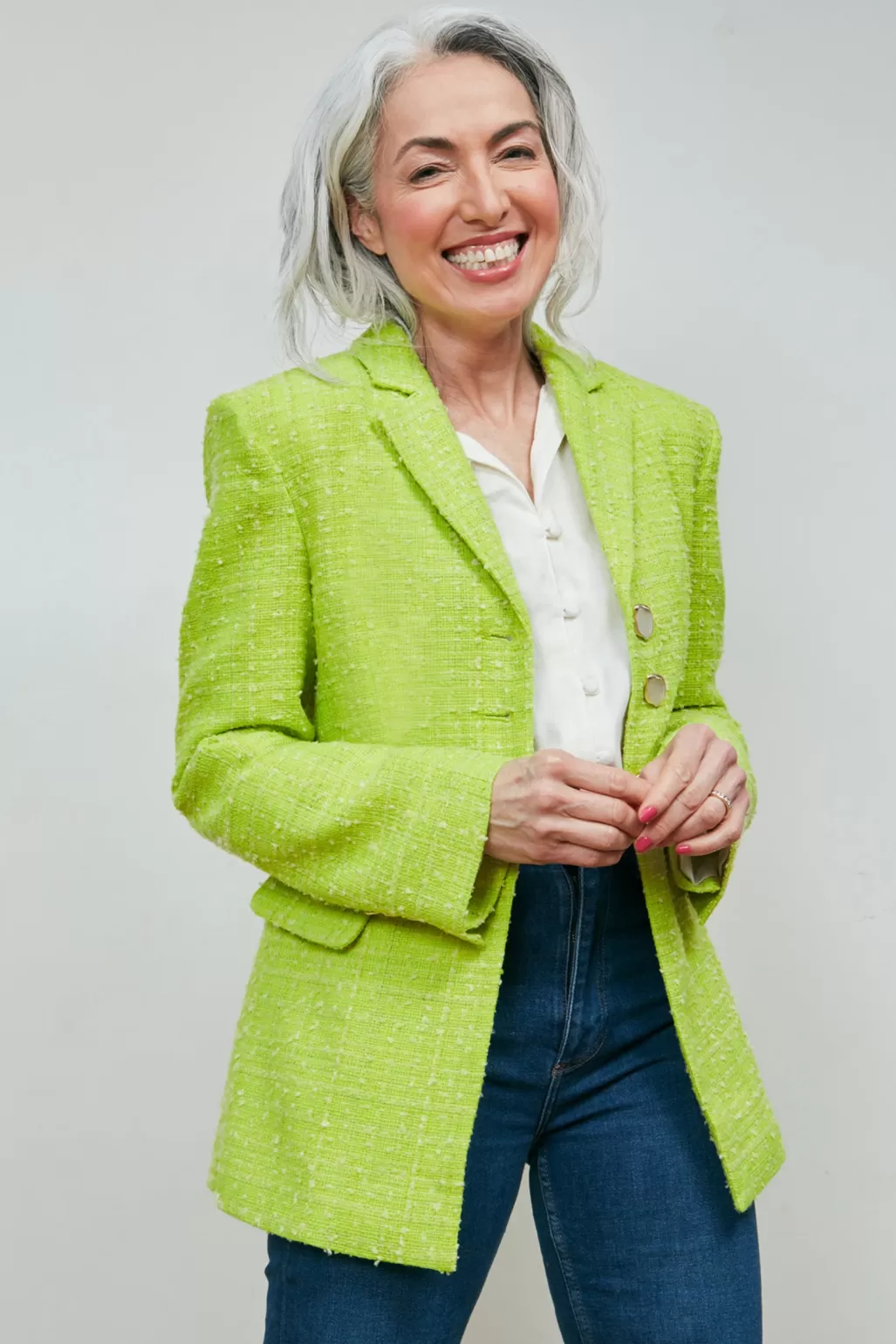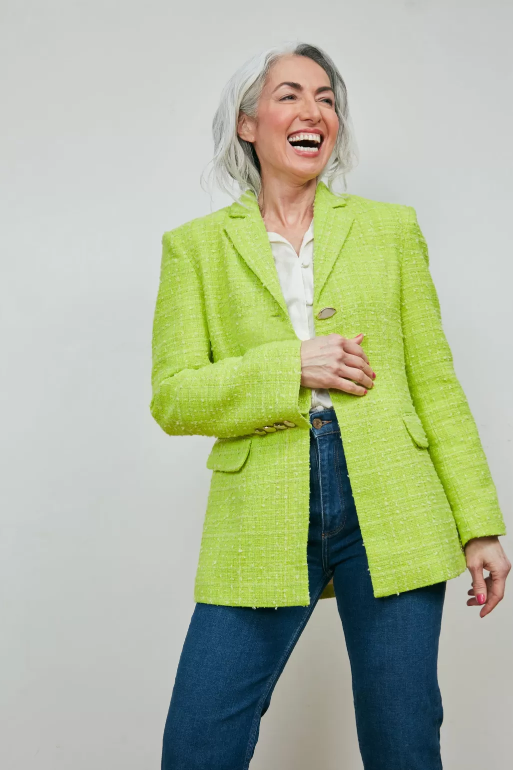 Elevate your smart casual attire with the Cher blazer, this chic piece, designed in a vibrant lime shade, brings a burst of energy to your wardrobe. With snug long sleeves and a timeless button-up front, the smart blazer exudes classic sophistication while offering endless possibilities for personal expression when combined with other wardrobe elements.