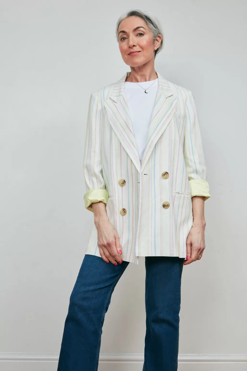 The blazer features pastel-toned stripes in lime, blue, and pinks is complimented by the fabulous lime lining, making it an ideal choice for the spring-summer season. The linen blend fabric not only adds comfort but also enhances the style of this blazer. The classic tortoise shell buttons add a touch of sophistication, ensuring a seamless blend of modern and timeless aesthetics.